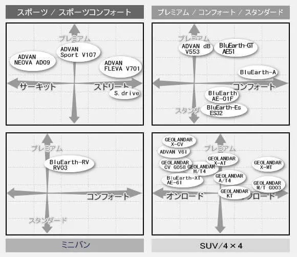 タイヤをメーカー別、カテゴリー別(スポーツ/スポーツコンフォート、プレミアム/コンフォート/スタンダード、ミニバン、SUV/4×4からなる4つ)のポジショニングで把握出来るようにしました。