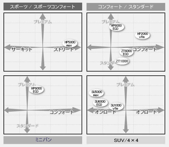 またスポーツ性能を強化する「‥max」シリーズ、コンフォートを主張する「‥ECO」シリーズなど「vfm」シーリーズを凌ぐブランドも投入され、主流に配置されています。