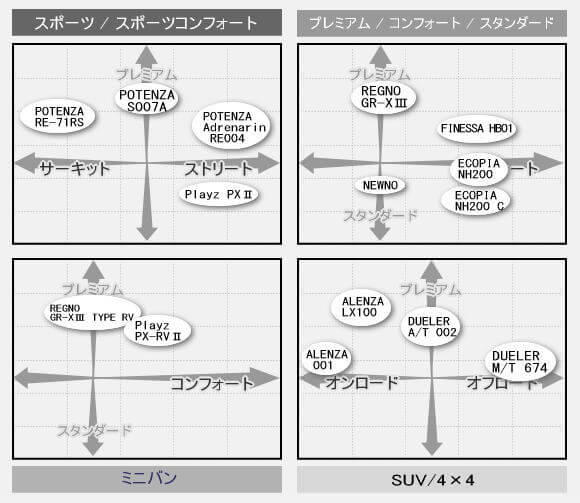タイヤをメーカー別、カテゴリー別(スポーツ/スポーツコンフォート、プレミアム/コンフォート/スタンダード、ミニバン、SUV/4×4からなる4つ)のポジショニングで把握出来るようにしました。